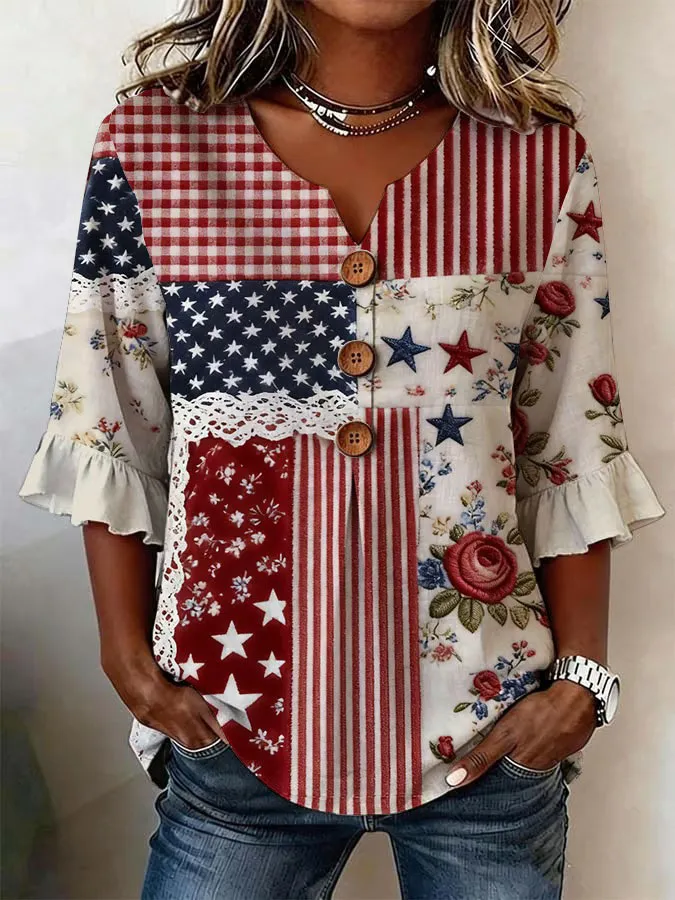 Women'S Independence Day 250Th Anniversary Flag Flower Art Retro Printed Casual Top