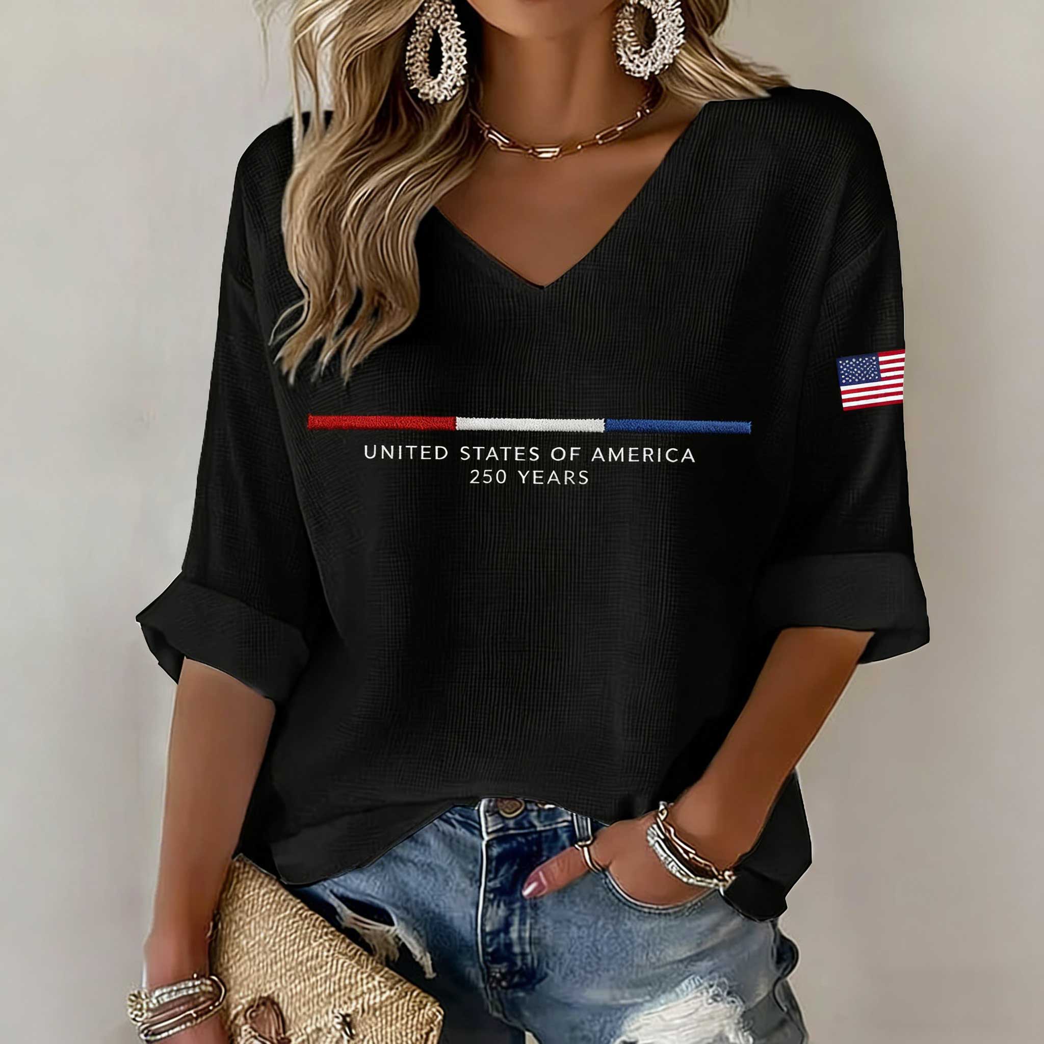 Women's USA 250th Anniversary Eagle & Stars Stripes Print V-neck T-Shirt
