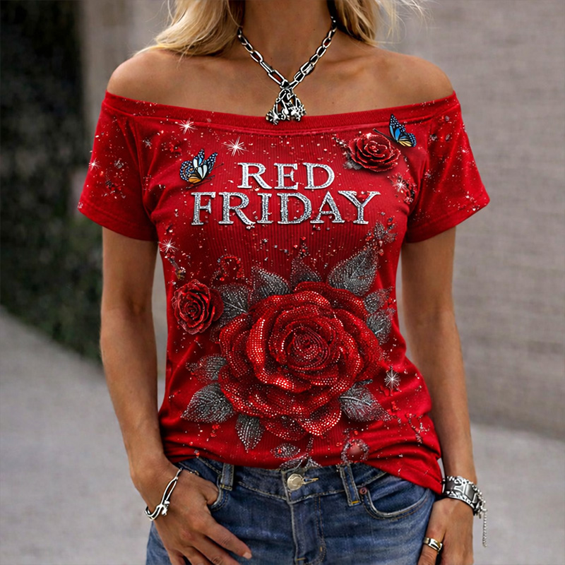 Women's Red Friday Print Casual Off-the-Shoulder T-Shirt