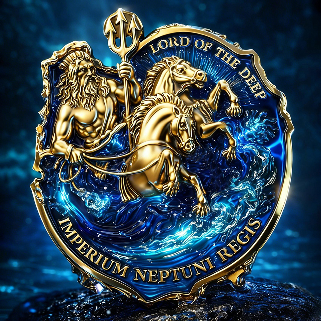 “IMPERIUM NEPTUNI REGIS” (Bottom Arc) 👉 Latin for "The Empire of King Neptune," a proud declaration of his aquatic dominion.