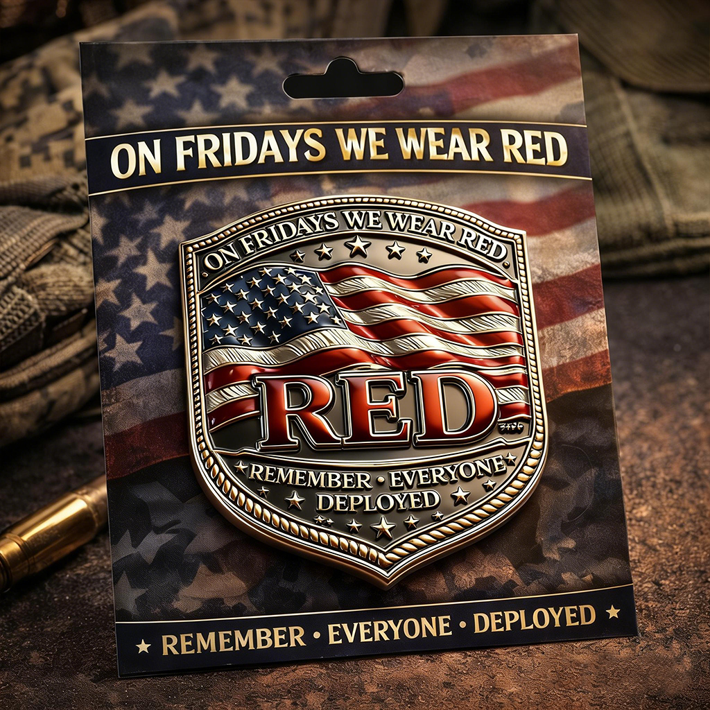 Featuring the iconic phrase “ON FRIDAYS WE WEAR RED” and “REMEMBER • EVERYONE • DEPLOYED”, this brooch serves as a daily reminder of courage, sacrifice, and national pride.