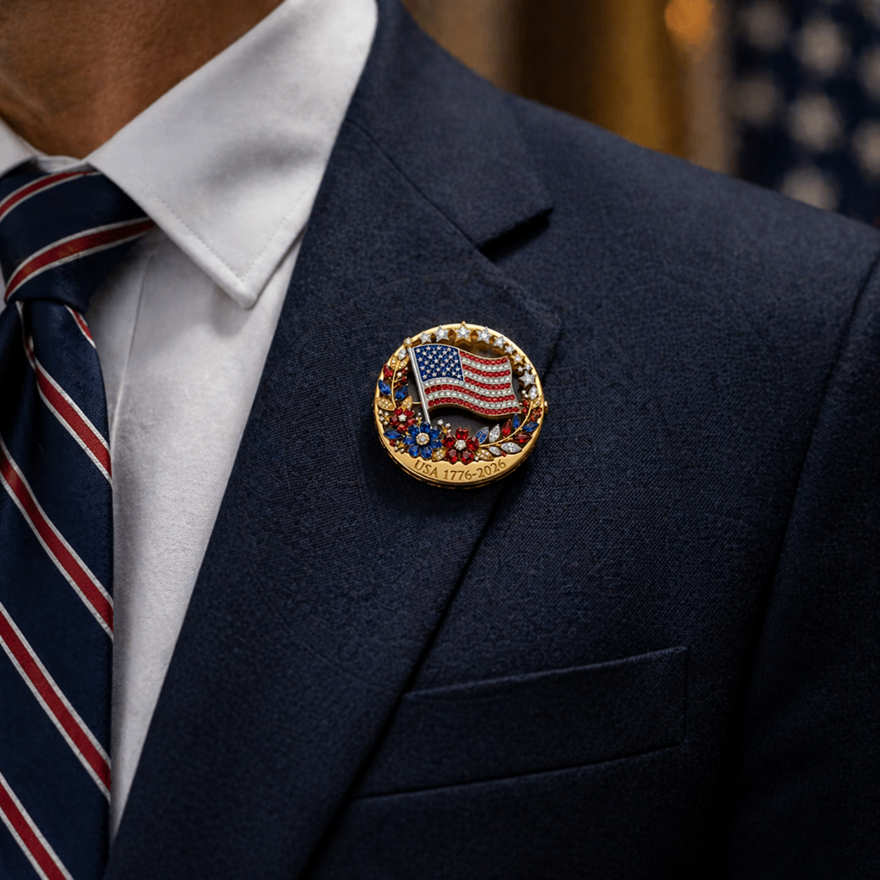 This brooch combines bold patriotic symbolism with fine craftsmanship, making it both eye-catching and elegant.
