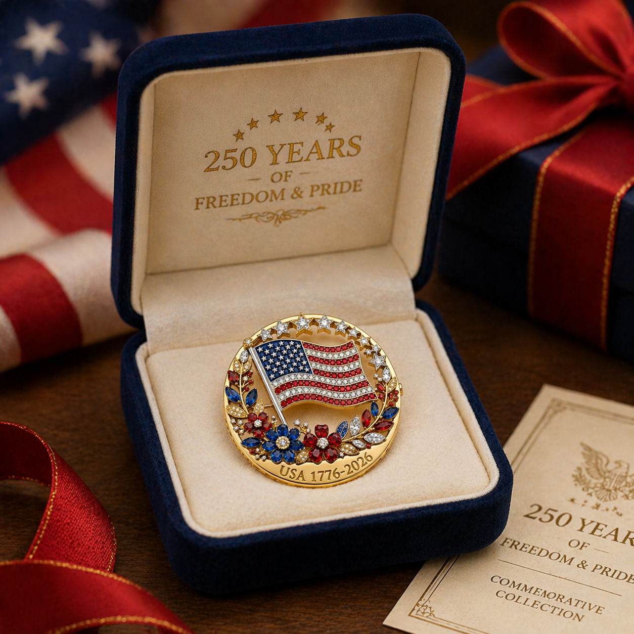 Celebrate America’s historic 250th anniversary (1776–2026) with this dazzling patriotic brooch, the perfect blend of timeless symbolism and sparkling elegance. Designed for proud patriots, history lovers, and collectors alike, this piece lets you wear your American pride with style.