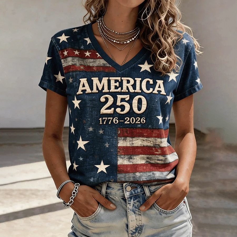 Women's 250th Anniversary American Patriotic Commemorative Retro Casual V-Neck T-Shirt