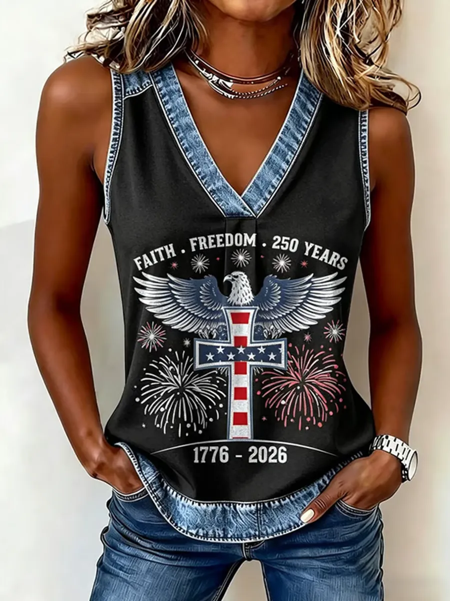Women's Vintage Cross 250th Anniversary Print Casual V-Neck Tank Top